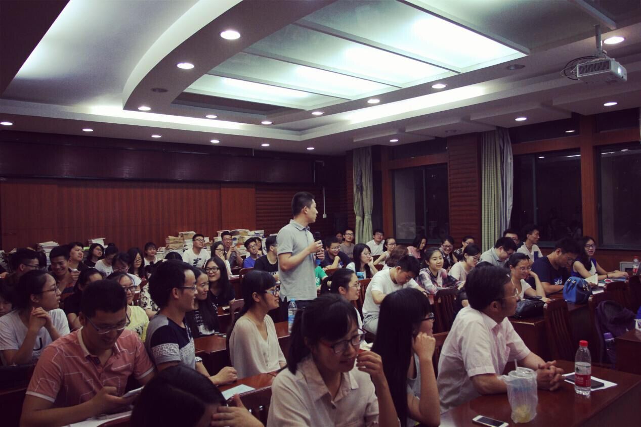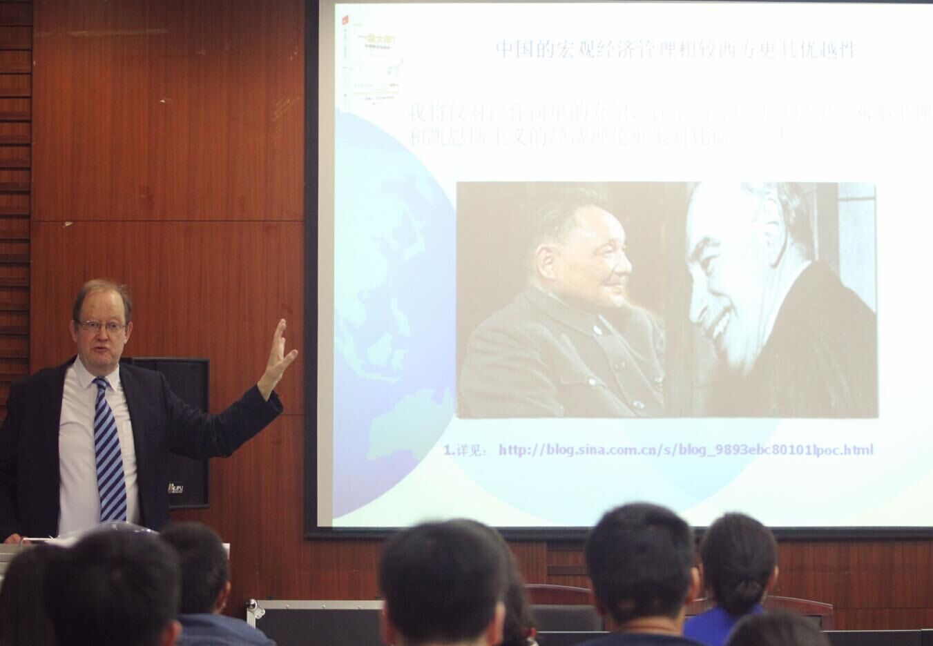 (学生记者周璞摄影邓书涛)6月5日晚7时,由经济学院主办的“中美大棋局——中国新命运解析”专题讲座在文泉楼206教室成功举办。本次讲座邀请了中国人民大学重阳金融研究院高级研究员、英国伦敦市前副市长、英国伦敦经济与商业政策署前署长、世界百强企业顾问、新浪财经专栏与外文出版社的获奖文章作者——罗思义先生做客我校,从“马克思主义经济学框架”和“西方马克思主义经济学”两个角度为大家讲授中西经济。我校近百余研究生参加了本次讲座,讲座由经济学院副院长罗良文教授主持。