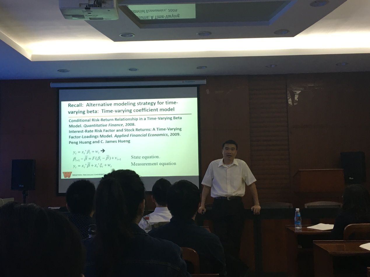 2017年4月15日14时30分,美国富布赖特学者、西密歇根大学教授C. James Hueng在经济学院206会议室为我院师生做了一次丰富精彩的学术讲座。讲座由经济学院陈浩教授主持,我院部分教师、研究生以及本科生参加了本次学术活动。