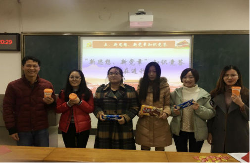 活动第五部分是“新思想”、“新党章”有奖知识竞答。竞答主要包含了新党章、十九大以及党史知识等方面的内容;比赛规则是由党支部组织委员李崇焕读题,宣布“开始”之后进行抢答,第一个回答且回答正确并完整的同学为胜,最终评出前6名获奖同学并颁奖。比赛现场如火如荼,党员们认真思考,积极抢答,表现出对党章以及十九大精神的熟练掌握。最终由白金同学获得一等奖,李娟娟和闫境华同学获得二等奖,余倩倩、刘培和陈思远同学获得三等奖。最后由支部书记刘怡君给大家颁发奖品,并且鼓励大家积极学习党章党史,学习十九大的新精神,加强自己的党性修养。