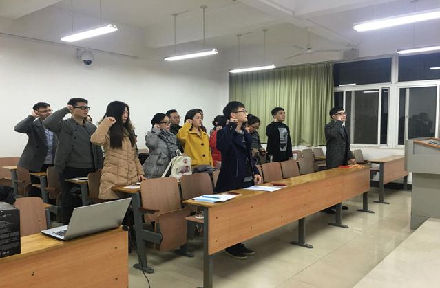 活动第一部分是奏唱国歌。当国歌奏响,全体齐唱《义勇军进行曲》,严肃的气氛,认真的表情,党员们的一种使命感充满着整个教室,心中升起一种无限振奋,无限光荣的情感。国歌奏毕,刘怡君向大家讲述了《义勇军进行曲》是如何成为国歌的曲折过程以及在田汉作词,聂耳作曲中的小故事,让大家充分了解到国歌创作的时代背景。同时提到,国歌中的一句词是——“中华民族到了最危险的时候。”,让大家想起各位革命战士用血肉为我们创造了美好的今天。虽然现在并不是各种所唱的“最危险的时刻”,但我们需要时刻提醒、鞭策自己,珍惜现在的学习环境,不断进步,将来做对祖国有用的人才。