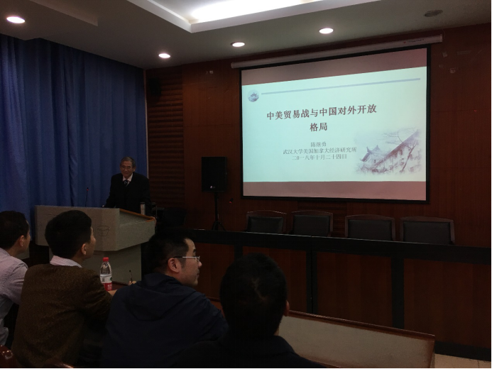 由米兰电竞·(中国区)经济学院举办的学术校庆、名家讲坛学术研讨会于10月24日晚18:30在文泉南楼206会议室顺利举办。本次研讨会邀请到了武汉大学珞珈杰出学者、二级教授陈继勇教授。陈教授给大家分享了以“中美贸易战与中国对外开放格局”为主题的讲座。经济学院李小平教授为本次研讨会的主持人。其中,经济学院的杨波教授、余娟娟副教授、吴珊珊副教授、周强博士、谢靖博士、潘安博士等,以及部分博士生和硕士生参加了本次学术研讨会。
