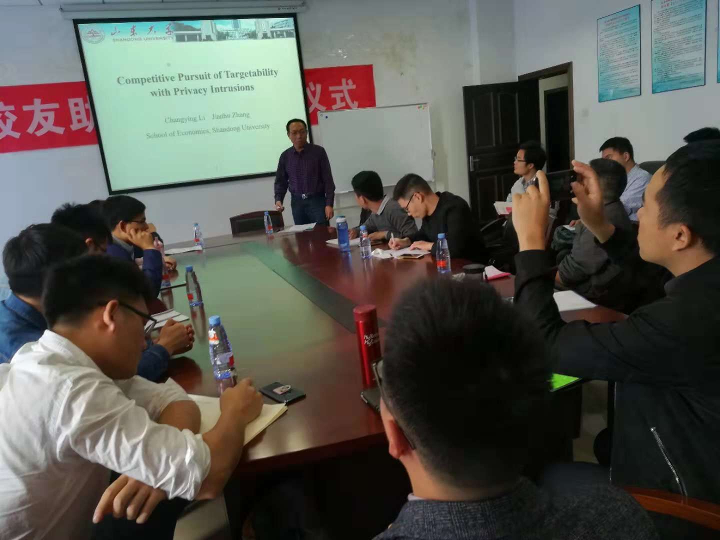 由米兰电竞·(中国区)经济学院举办的2018年第15期“经济中南”学术研讨会于11月3日上午10:00在文泉南楼207会议室顺利举办。此次研讨会有幸邀请到了山东大学经济学院李长英教授。李教授结合其最新研究成果,做了主题为“Competitive Pursuit of Targetability with Privacy Intrusions”的研究报告。李小平教授作为本次研讨会主持人,经济学院王啸华博士、苗双有博士、袁凯华博士、周强博士等,以及本院博士研究生、硕士研究生、本科生等参加了本次研讨会。