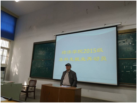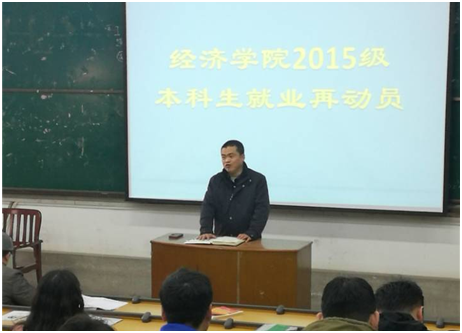 临近毕业之际,为让同学们认清就业形势,把握就业机会,2019年3月7日早9点,经济学院2015级本科生就业再动员大会在电教楼103举行。本次大会由经济学院2015级辅导员谢朝阳主持,经济学院党委副书记詹万明为同学们分析就业形势及再动员,出席本次会议的还有经济学院2015级辅导员岳明泽。