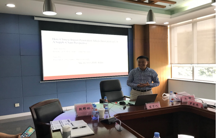 复旦大学罗长远教授汇报的论文题目是《How Chinese Import Penetration Affects Innovation in U.S. A Supply-Chain Perspective》。罗教授首先回顾了之前学者的相关研究,总结了之前学者的观点:美国从中国进口导致美国创新行为下降了。之后罗教授提出他们的创新之处在于从价值链出发将美国向中国进口的产品分为三个层次,即水平方向上中国的进口渗透、下游方向上中国的进口渗透、上游方向上中国的进口渗透。通过数据分析,罗教授发现在不考虑三个维度时,他们的结论与之前的研究结论相似,但将上游、下游、水平三个维度纳入分析后发现,中国进口渗透影响美国供应链创新主要出现在下游方向。进一步研究发现学习效应的存在是出现中国下游进口渗透影响美国供应链创新的主要因素。
