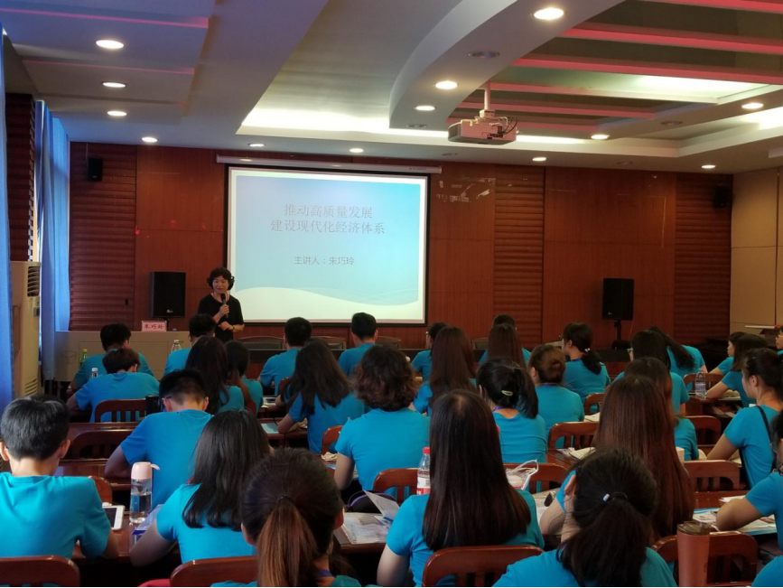 开营仪式结束后,我院政治经济学专业博士生导师朱巧玲教授与营员们分享了题目为“推进高质量发展,建设现代化经济体系”的学术报告,就习近平总书记在汉讲话以及新时代发展理念、高质量发展的内涵与特征还有现代化经济体系等方面作出了具体阐述,同时也对中美贸易战和政治经济学学科建设进行了讲解与介绍。同学们积极与老师互动,获益匪浅。