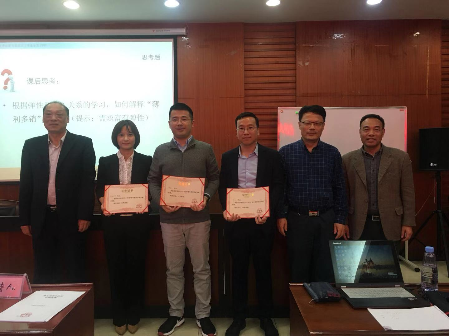 经过学院全体专任教师的评分,潘安老师获得了此次竞赛的一等奖,周强老师和杨柳青青老师并列获得二等奖,三位老师分数非常接近。教务部王良圣副部长、卢现祥院长和陈勤舫书记给三位老师颁发了获奖证书,以资鼓励。