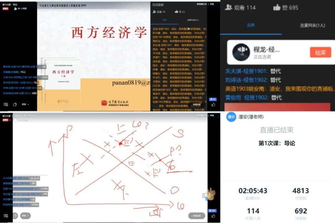 潘安老师在网络授课中,采取钉钉群视频直播的方式,进行了公共专业必修课《微观经济学》的线上教学,并在QQ群同步上传课件、学习材料,布置随堂作业。为了让学生能更好的看清板书、听清声音,他还特别准备了写字板和话筒;为了保证学生出勤率,他课前通知每位同学提前5分钟上线打卡。在课堂上,潘安老师风趣幽默,用生动活泼的语言让课堂变得轻松活跃,同学们纷纷为老师点赞,积极申请连麦互动,教学效果得到了保证。