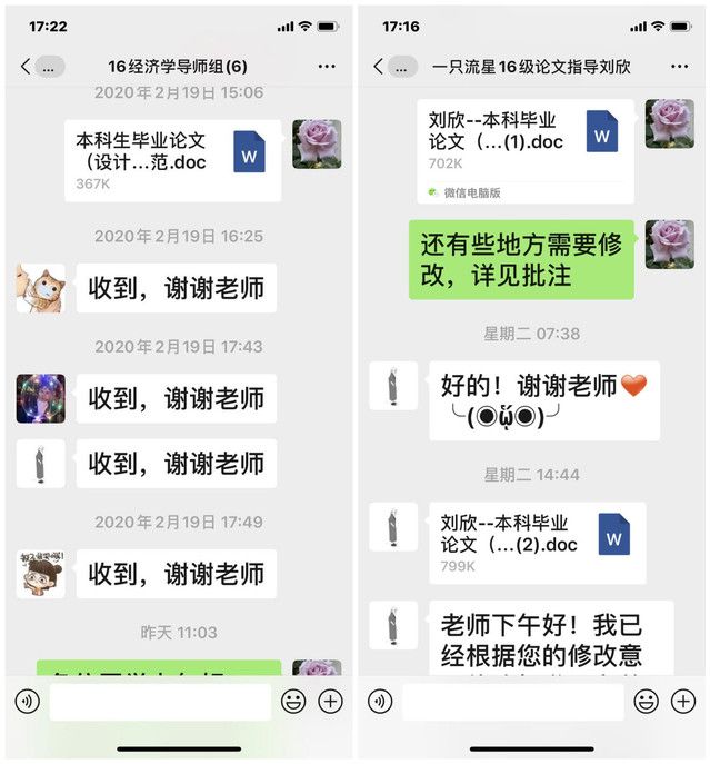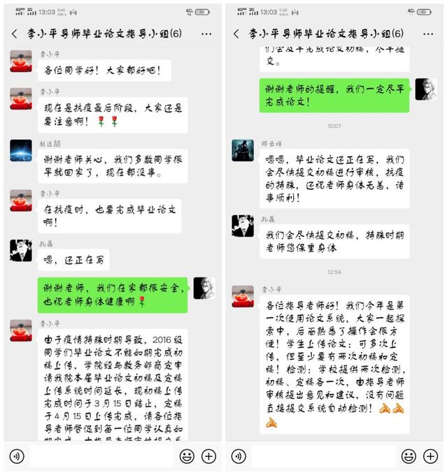 隔离疫情不隔离思想的碰撞。疫情期间,经济学院老师充分利用网络,就学生论文进行督促与指导,师生隔空“对话”,开启了思想的碰撞,点燃了思辨的火花。李小平老师一方面关心学生的身体状况和心理状况,提醒大家加强自我保护;另一方面督促大家努力学习,及时完成毕业论文,并对学生在论文撰写中遇到的各种问题予以耐心指导帮助。