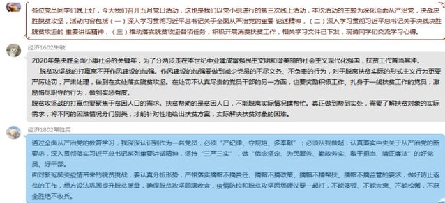 2020年5月17日-5月20日,经济学专业本科生党支部开展 “深化全面从严治党,决战决胜脱贫攻坚”为主题的五月党日活动。由于疫情期间无法以线下形式开展党日活动,经济学专业本科生党支部继续这两个月的党日活动形式,以自主学习、感悟分享与心得体会的方式进行党日活动,全体党员、预备党员参加本次活动。