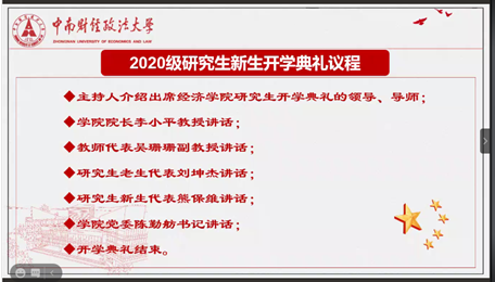 (通讯员:丁乙宸)9月9日下午四点半,受疫情防控要求,经济学院2020级研究生新生开学典礼以网络视频方式顺利召开。经济学院党委书记陈勤舫老师、经济学院院长李小平教授、经济学院党委副书记詹万明老师、经济学院副院长罗良文教授、各专业导师以及全体2020级硕士、博士研究生新生出席典礼,本次典礼由经济学院副院长罗良文教授主持。