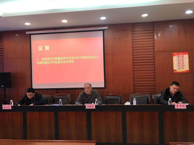校党委组织部副处级组织员李明代表学校党委宣读《关于经济学院新一届党委和纪委有关候选人预备人选组成方案的批复》。