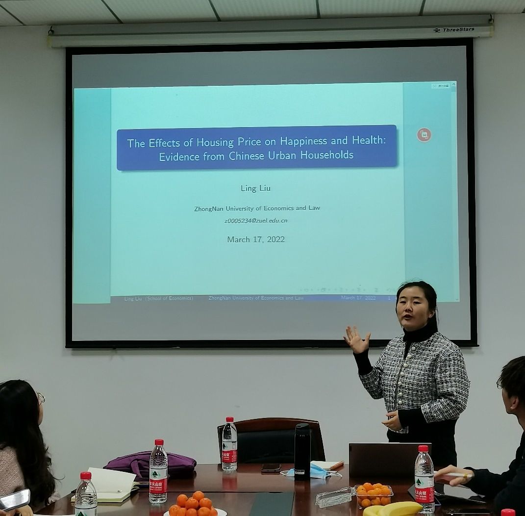2022年3月17日18:30-20:30,经济中南第51期Seminar于文泉楼南207成功举办。本期Seminar我们有幸邀请到我校经济学院讲师刘玲,刘老师此次分享的主题为:The Effects of Housing Price on subjective well-beings and Health:Evidence from Chinese Urban Households.本期Seminar采取线下的方式开展,由我院教师何凌云主持,潘峣评议,全校师生共十余人参与此次会议。