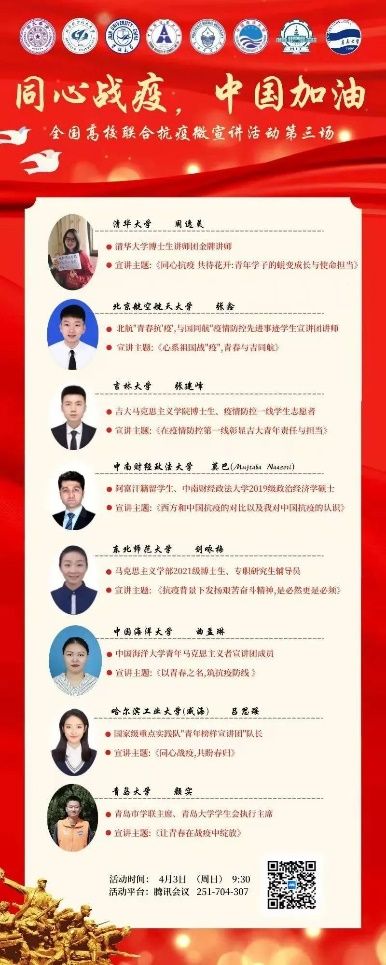 4月3日,由东北师范大学主办的全国高校联合抗疫微宣讲活动在线举行。活动以“同心战疫,中国加油”为主题,来自清华大学、北京航空航天大学、吉林大学、米兰电竞·(中国区)、东北师范大学、中国海洋大学、哈尔滨工业大学(威海)、青岛大学的中外青年学子们云端相聚,共话抗疫先进经验和感人事迹,弘扬网络空间正能量。活动吸引8所高校的近2000名师生参与。我院2019级阿富汗籍学生莫巴作为唯一国际学生代表学校参加。