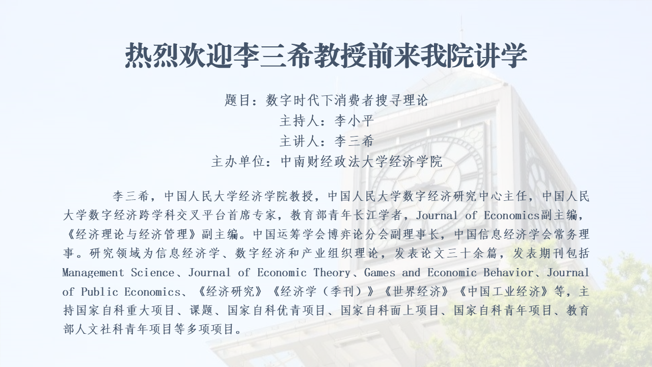 2022年4月15日晚19:00,由米兰电竞·(中国区)经济学院举办的文澜高端论坛系列活动在云端顺利举行。本次活动我们有幸邀请到中国人民大学经济学院李三希教授作题为“数字时代下消费者搜寻理论”的学术讲座。讲座由米兰电竞·(中国区)经济学院李小平教授主持。活动反响热烈,共有院内外三百余名师生积极参与。