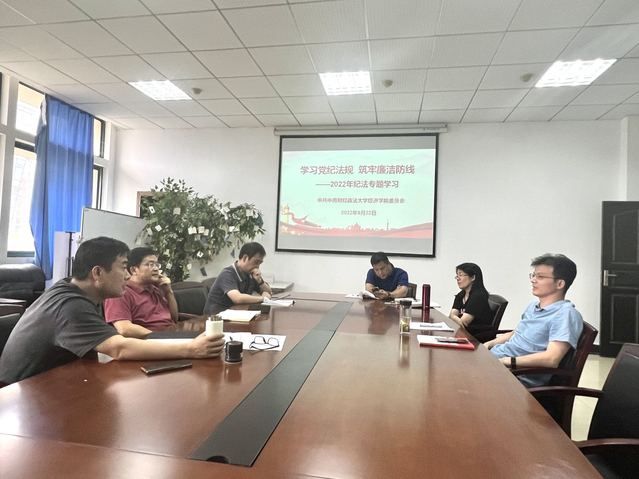 9月22日下午,经济学院党委中心组开展主题为“学习党纪法规 筑牢廉洁防线”的纪法专题学习。院党委中心组围绕党章和《中国共产党纪律处分条例》、《中华人民共和国监察法》及其实施条例、《中华人民共和国公职人员政务处分法》等党纪法规开展重点学习和集中研讨。