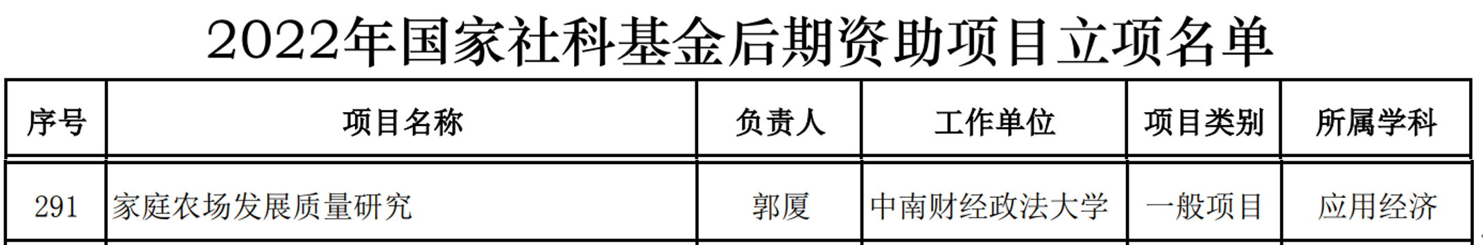 2022年11月29日,全国哲学社会科学工作办公室官网发布《2022年度国家社科基金后期资助暨优秀博士论文出版项目立项名单公示》,我院郭厦老师的《家庭农场发展质量研究》获得应用经济学的一般项目立项。