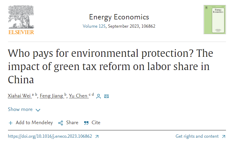 2023年7月,以我院教师陈语副教授作为通讯作者的合作论文《Who pays for environmental protection? The impact of green tax reform on labor share in China》在经济学国际知名期刊《Energy Economics》上正式发表。