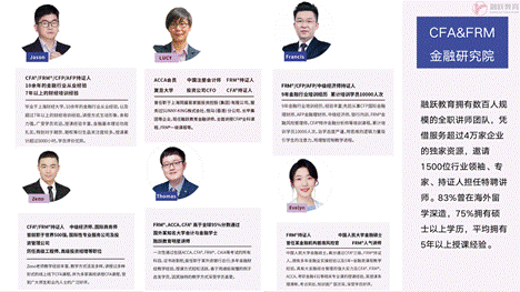 融跃教育致力于打造迎合未来金融市场发展需求的复合型金融人才培养课程体系,在CFA&FRM 双证班的教学中不仅科学的融合了 CFA 课程、FRM 课程、核心金融词汇课程等内容,还重视学生财商软技能的培养,兼容并蓄,相辅相成,帮助学员在金融行业大变革的时代里披荆斩棘,成长为高素质金融人才。