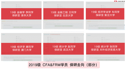 ①助力本科专业课学习,辅助保研:CFA&FRM课程涵盖内容广,涉及专业知识深,和许多财经类专业的必修课程都有交叉,如:《金融市场学》《资产组合分析与管理》《概率论》《统计学》《计量经济学》《随机过程和时间序列》《投资银行学》等。学习CFA&FRM不仅是为了持证考试做准备,同时对专业课的学习也有一定帮助。