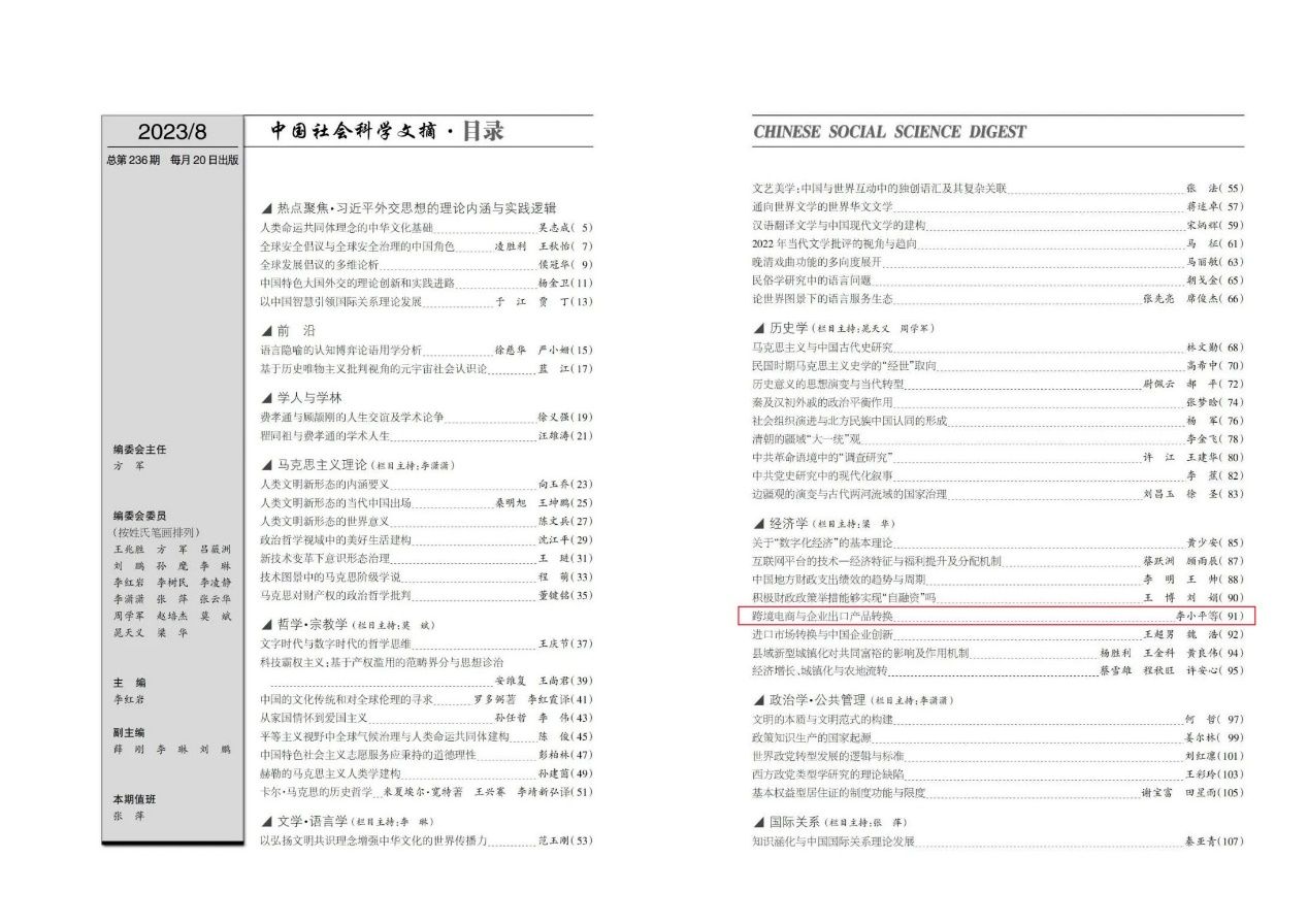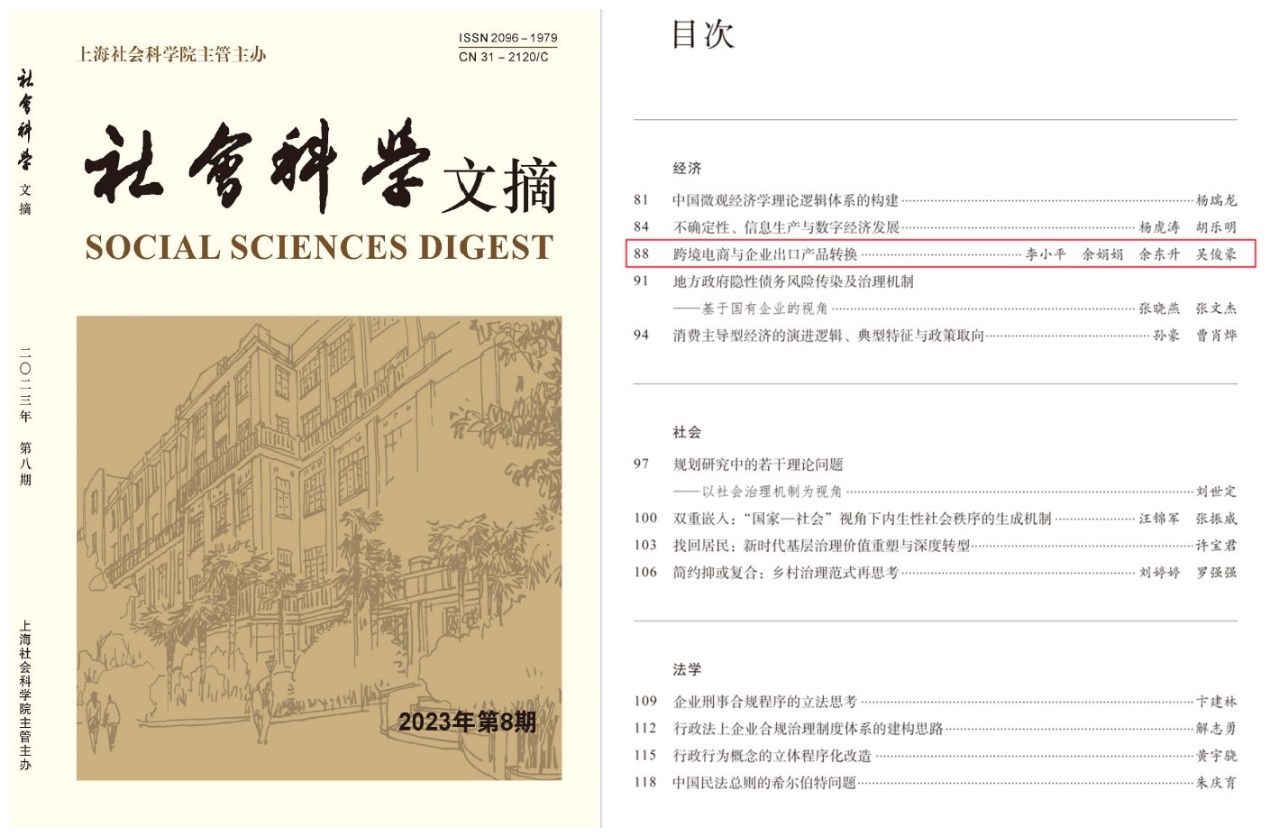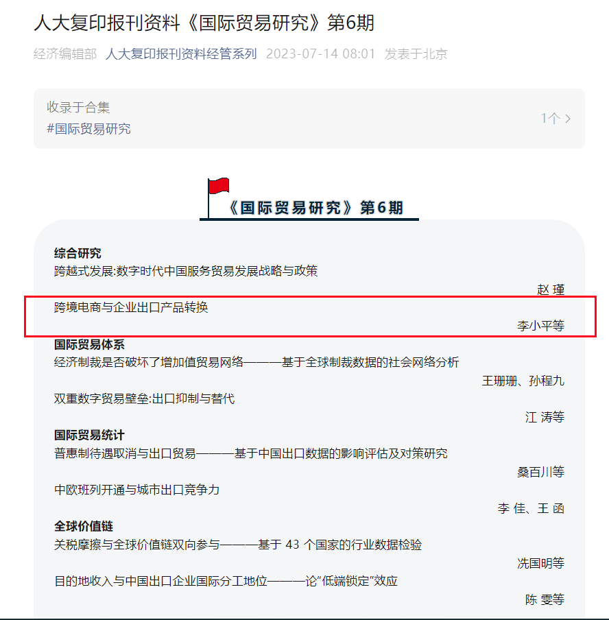 近日,我院李小平教授团队发表于《经济研究》2023年第1期文章《跨境电商与企业出口产品转换》先后被《中国社会科学文摘》2023年第8期转载,《人大复印报刊资料·国际贸易研究》2023年第6期转载,《社会科学文摘》2023年第8期转载。