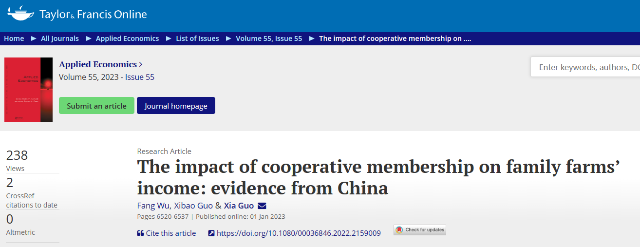 2023年9月,以我院教师郭厦副教授作为通讯作者的合作论文《The impact of cooperative membership on family farms’ income: evidence from China》在经济学国际知名期刊《Applied Economics》上正式发表。