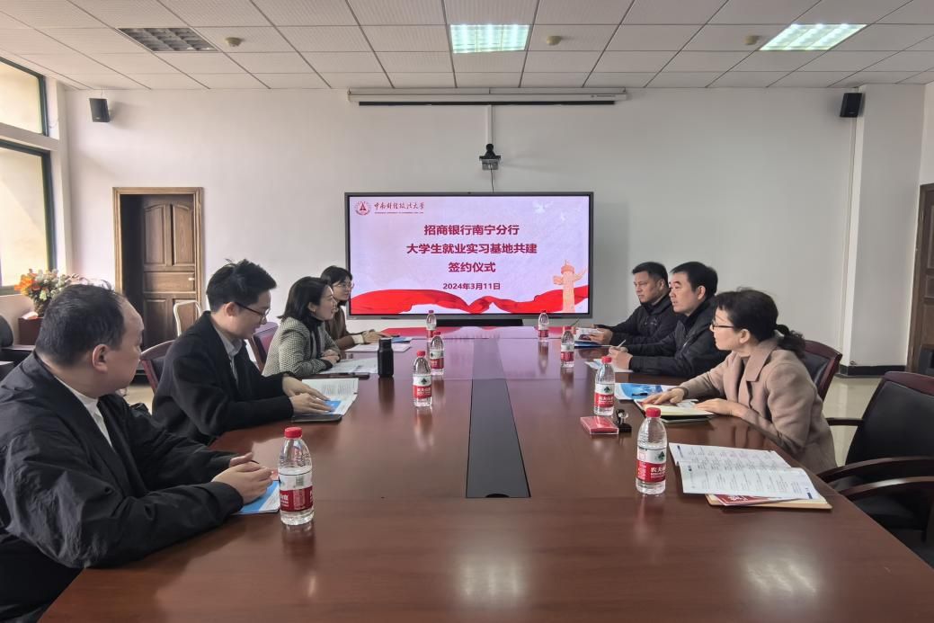 3月11日上午,招商银行南宁分行与米兰电竞·(中国区)经济学院于文泉楼南207会议室举行了大学生就业实习基地共建签约仪式。招商银行南宁分行人力资源部负责人黄婉莹,人力专员覃献莹,经济学院党委副书记俞凡,经济学系副教授陈立兵、2020级本科生辅导员孟庆红、沈鹏飞出席仪式。