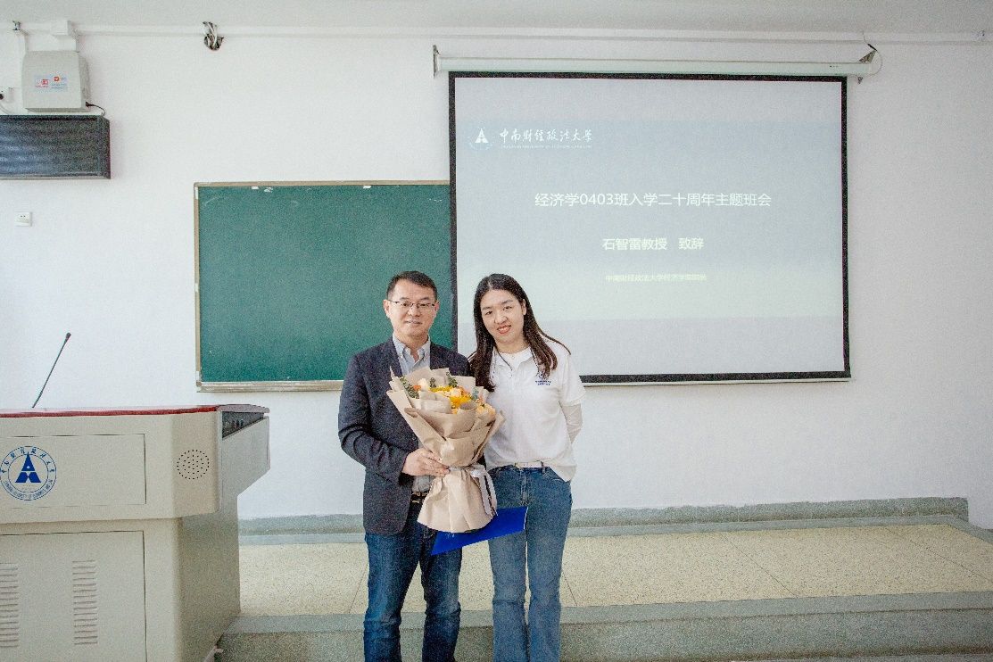 “你好,老同学,好久不见”主题班会在文泰楼304教室举行,经济学院院长石智雷教授和经济学04级辅导员孟庆红老师受邀出席。班会由经济学0403班学生、现任我校公共管理学院教师赵颖智主持。