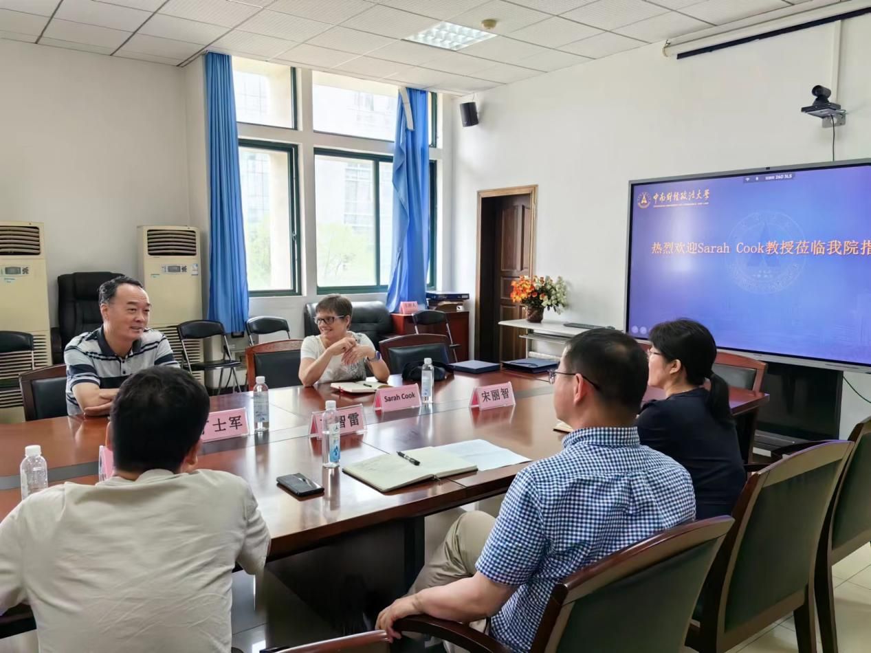 石智雷对Sarah Cook教授来访表示热烈的欢迎,感谢丁士军教授为经济学院搭建了此次交流的平台。石智雷为Sarah Cook教授详细介绍了经济学院的历史以及学院在学科建设、教育教学、人才培养、国际合作等方面取得的成绩,希望以此次交流为契机,未来在学科建设与发展、学术研究、国际交流等方面进一步加强沟通与合作。