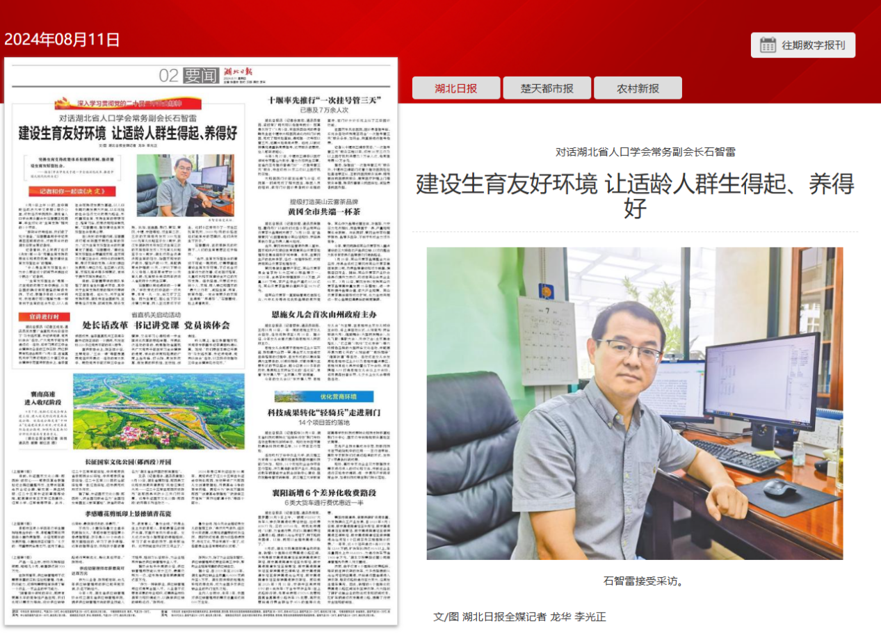 近日,我院院长石智雷教授就党的二十届三中全会《决定》中“完善生育支持政策体系和激励机制,推动建设生育友好型社会”话题,接受《湖北日报》记者专访。