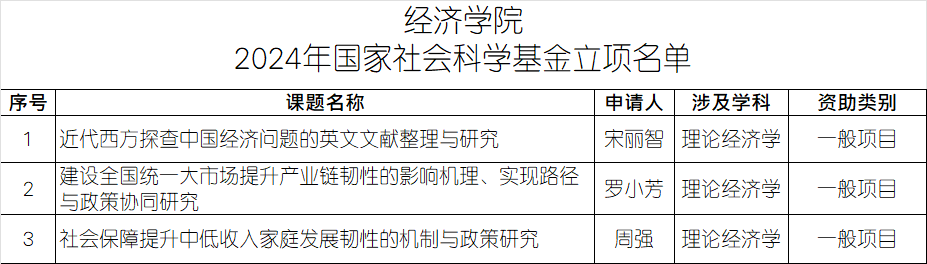 9月14日,全国哲学社会科学工作办公室发布了《关于2024年国家社会科学基金年度项目立项名单的公示》,公示了本年度国家社会科学基金项目评审结果。经济学院宋丽智教授、罗小芳教授和周强副教授申请的一般项目成功获得立项。祝贺各位老师!