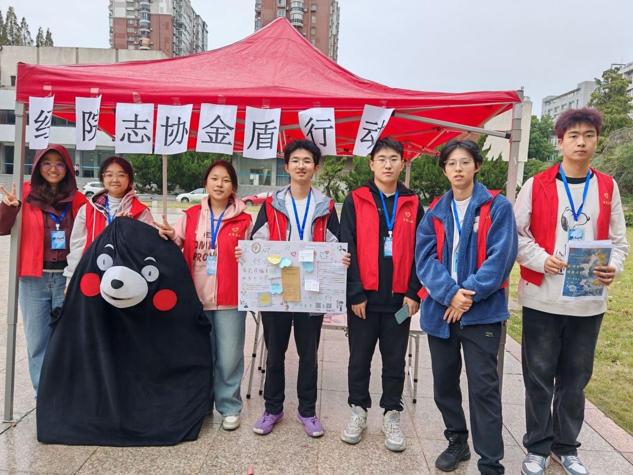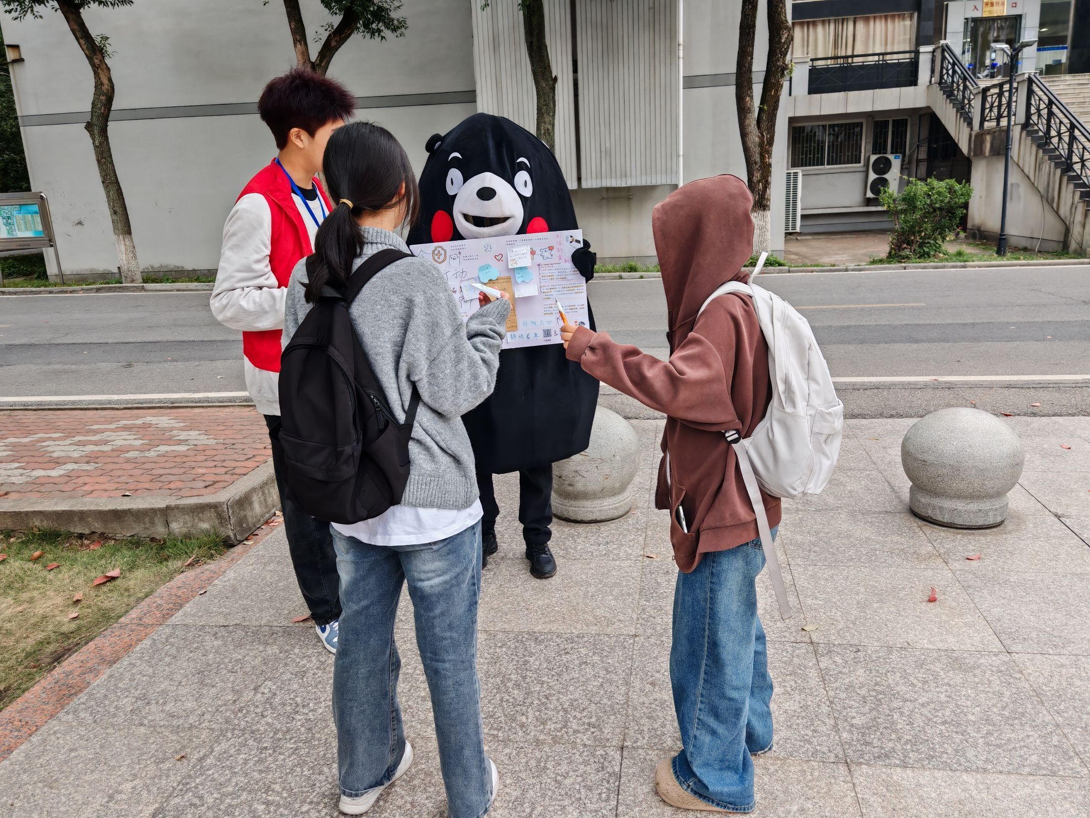 为了更有效地吸引同学们的注意,志愿者们别出心裁,轮流穿上可爱的小熊玩偶服进行宣传,并积极与参与者们互动。不久之后,摊点便变得热闹非凡。在玩偶小熊的引领下,同学们络绎不绝地前来参与活动。