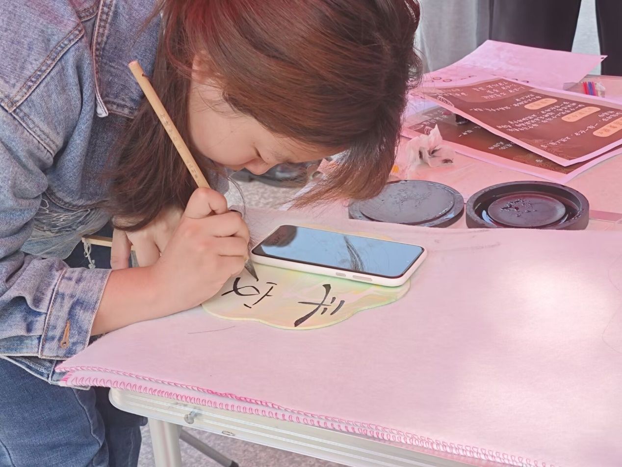 “怳怳如闻神鬼惊,时时只见龙蛇走。左盘右蹙如惊电,状同楚汉向攻战。”书法是中华文化传承的重要方式之一,各种字体承载了不同历史时期的文化信息和审美情趣。来自书法社的志愿者手握一支毛笔,为参与的同学们在书签上题字,给予他们足够有纪念意义的礼物。手持空白书签的同学们有序地排着队等待,期待的情绪洋溢在脸庞,想必中华民族传统文化的重要组成部分——书法正深深吸引着在场的中华儿女。