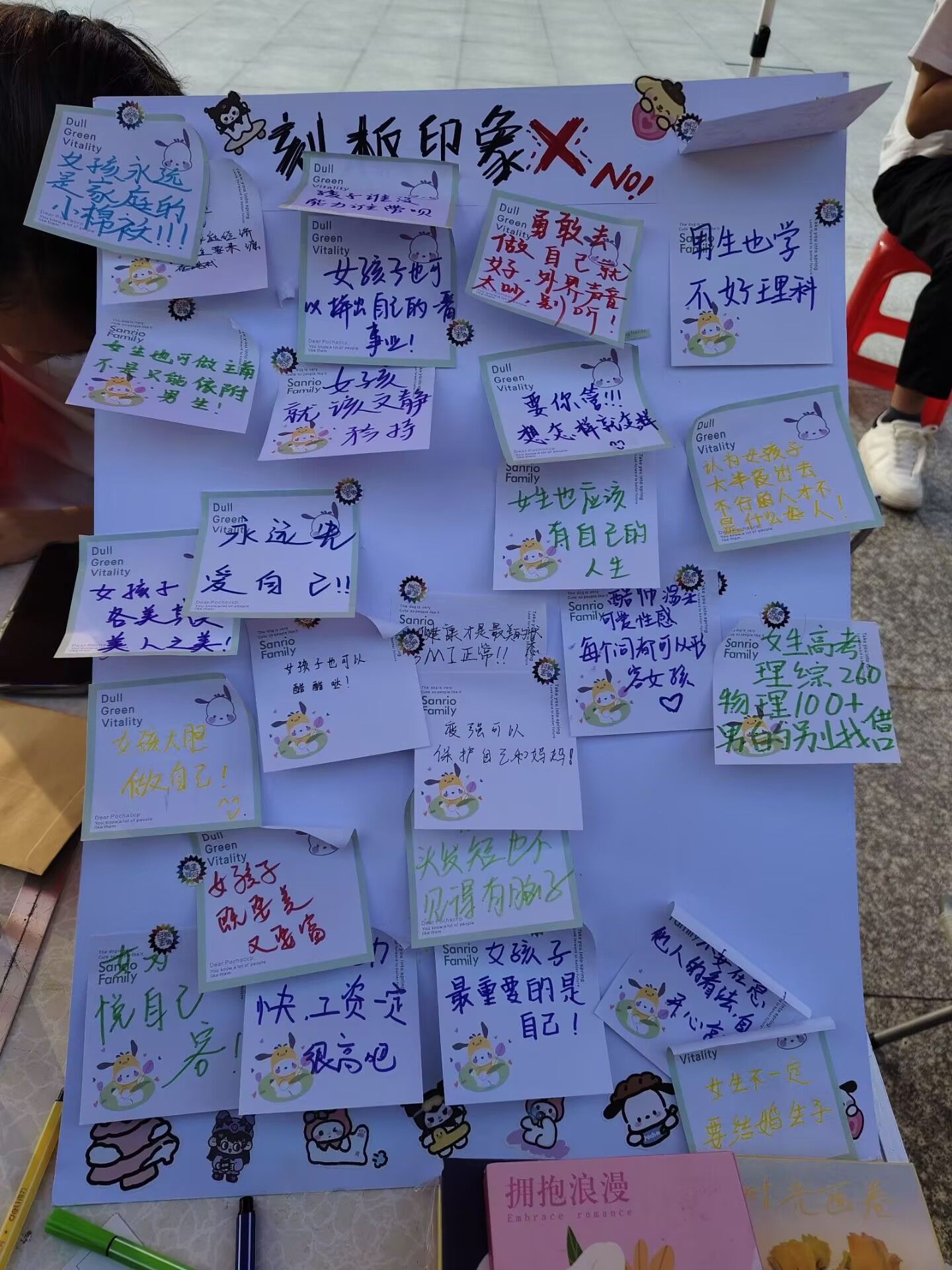 为了打破性别刻板印象,鼓励同学们自我肯定,在本次活动中,志愿者们特别设计了“撕标签”环节。参与者们勇敢地撕掉那些写着负面标签的贴纸,用积极向上的自我鼓励话语取而代之。这一环节表达出强烈的信息:我们要拒绝被他人定义,勇敢地找自己做自己,追求自我成长与自爱。通过这一环节,同学们更加明白了要活在自己的热爱之中,而不是活在他人的目光之下。这一环节不仅仅丰富了本次活动的内容,也深化了活动的意义,让每个人都能以更加积极的态度来面对自己,面对生活。