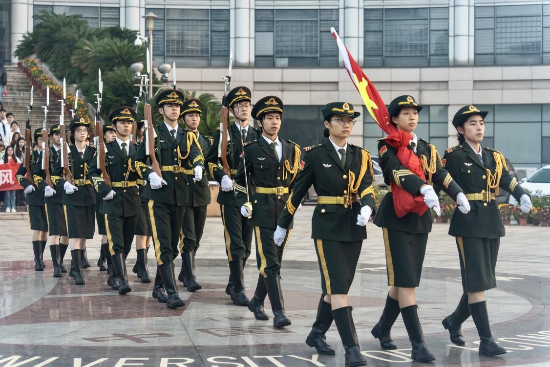 国旗高扬领青春。上午7时整,东方泛起旭光,升旗仪式正式开始。国旗护卫队员英姿飒爽,迈着铿锵有力的步伐,护送五星红旗走向升旗台。雄壮激昂的国歌响起,鲜艳的五星红旗迎风飘扬,全体师生肃立,奏唱国歌、行注目礼。