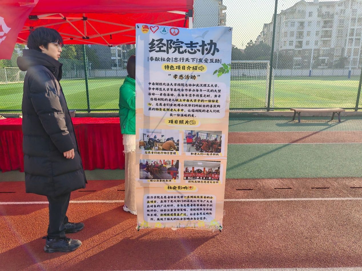 活动当天,暖阳高照,晴空万里。阳光洒落在操场上,将草坪和跑道照得透亮,投出斑斓的光斑,犹如一幅绚丽的志愿画卷,温暖着在场每一位同学的内心。经院志协志愿者们身着红色马甲,胸戴志愿工牌,在摊点热情地组织互动小游戏与爱心义卖活动,让同学们在活动中体会到志愿温情与经济特色。