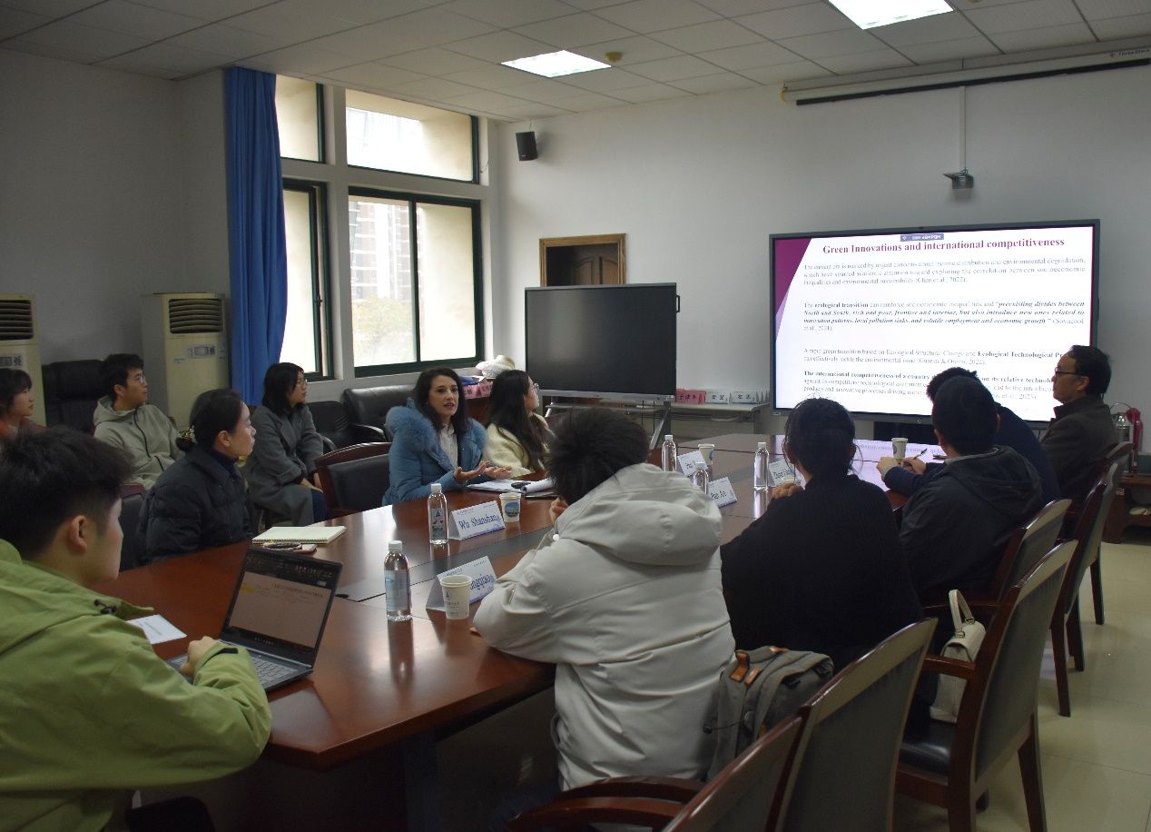2024年12月10日上午10点,第77期“文澜高端论坛系列活动”在文泉楼南207会议室成功举办。意大利图西亚大学的助理教授Chiara Grazini受邀以“International Competitiveness and Environmental Sustainability: the Role of Environmental Regulation and Open Eco-innovation”为主题,分享了环境规制和开放生态经济在国际竞争力对环境可持续性影响中发挥的作用。本期讲座由潘安教授主持,工商管理学院丁士军教授,经济学院吴姗姗教授、潘峣副教授、严雅雪副教授、张亮老师、舒中桥老师、经济学院硕博生等20余人参加。
