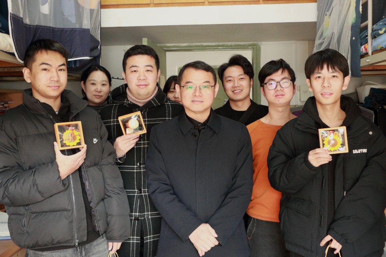 (学生记者 刘路洋 摄影 刘路洋)“书卷多情似故人,晨昏忧乐每相亲。”在这个呵气成霜的冬日,考研的战鼓即将敲响。为了给考研学子们加油鼓劲,经济学院精心筹备了一场暖心关怀活动,为他们送去温暖与力量,用实际行动为他们的逐梦之旅保驾护航。12月18日,经济学院院长石智雷、副院长宋丽智及学生工作办公室的老师们走访2021级学生宿舍,将学院精心准备的备考礼包送到同学们手中。