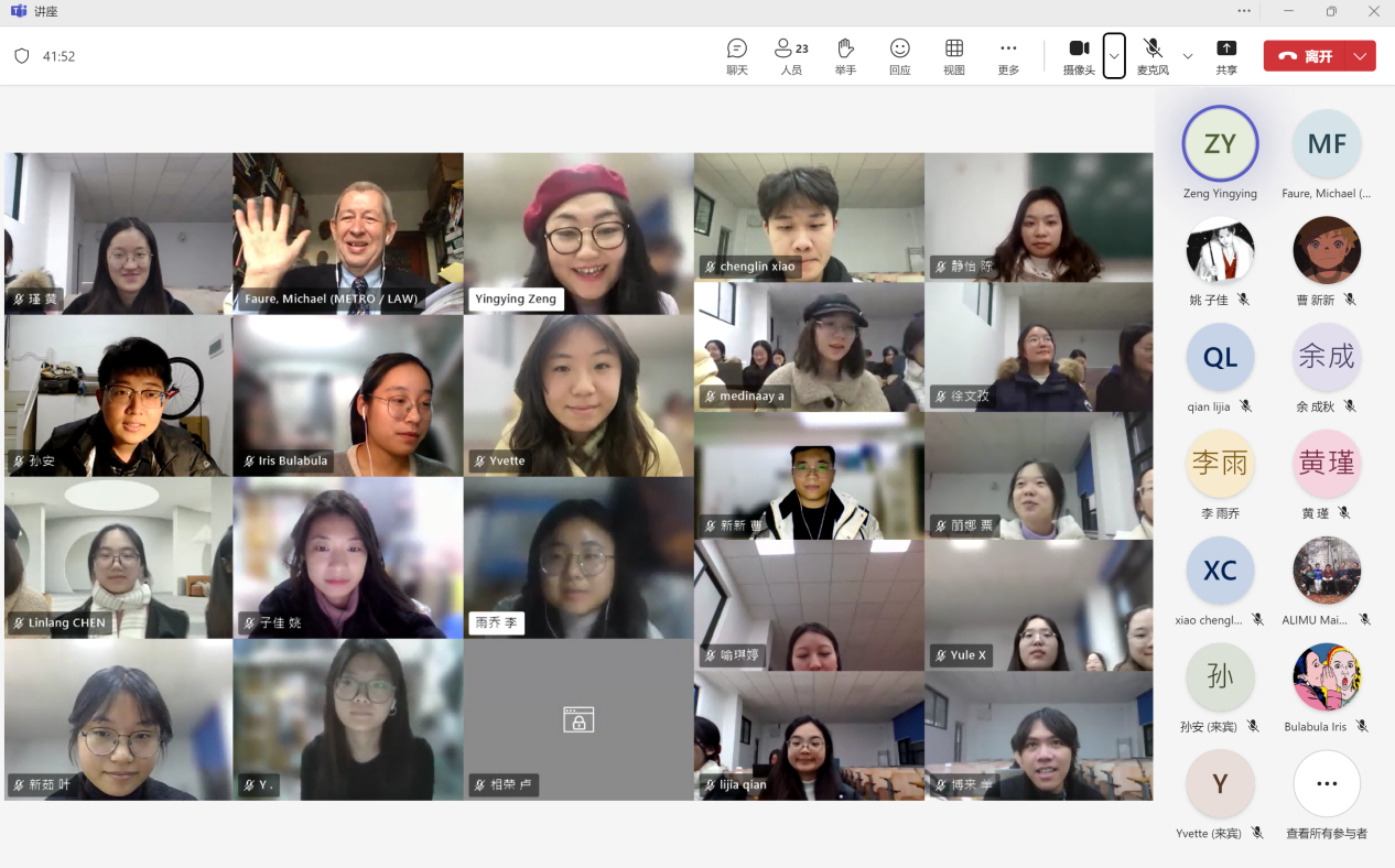 在问答环节,学生们积极探讨了气候变化的经济影响及市场政策的延迟性、国际商法专业学生申请成为商事仲裁员等学术和职业议题。Faure院士鼓励学生深入学习法律经济学,阅读《法律的经济分析》等经典教材和论文,了解前沿研究,以应对气候变化的挑战。同时,Faure院士强调了石油、采矿和水泥等行业正在面临的转型挑战,并指出无论是基于市场工具还是传统的规制,关键在于提供有效的激励以促进减排。