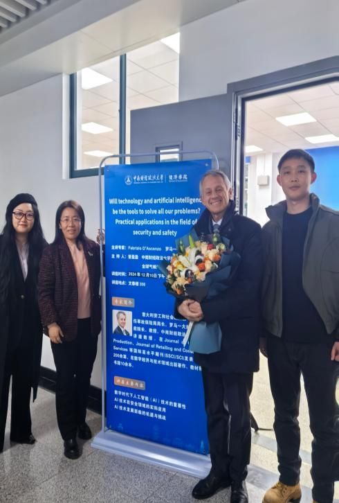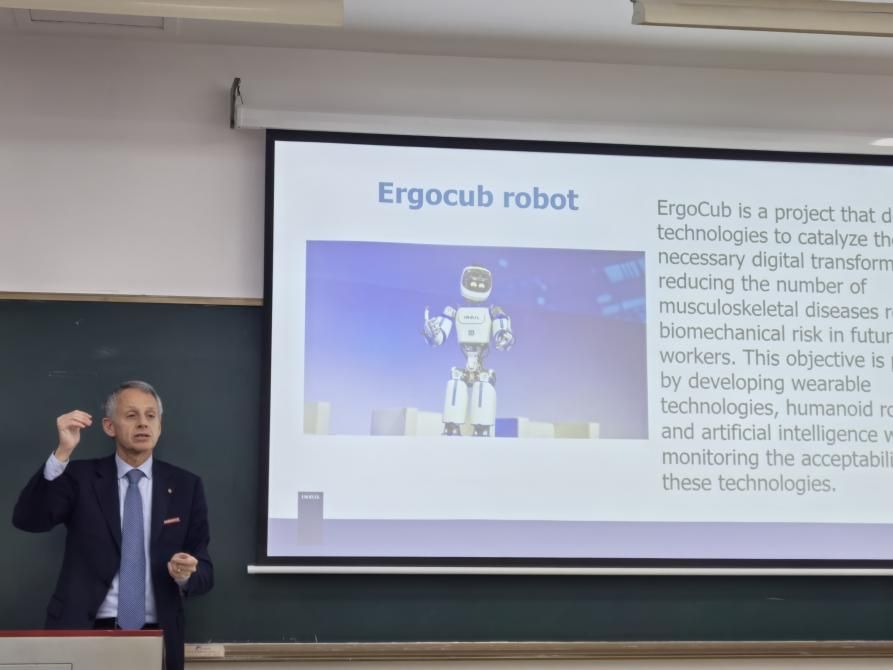 12月10日,意大利劳工和社会政策部·国家工伤事故保险局局长、罗马一大经济学院Fabrizio D' Ascenzo教授以“Will technology and artificial intelligence be the tools to solve all our problems? Practical applications in the field of security and safety”为主题,为师生们带来了一场关于人工智能(AI)的讲座。内容涵盖了AI定义、技术类型(如专家系统、神经网络等)、联合国的五大AI指导原则、AI的自动化、工业生产优化等主要应用。此外,D' Ascenzo教授介绍了意大利国家工伤事故保险局(INAIL)在减少职业病风险和环境监测方面的AI项目,如Ergocub机器人和无人机技术。