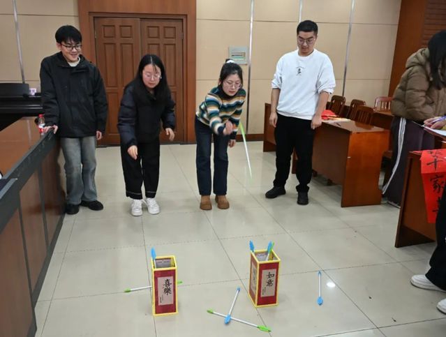 投壶比赛中,同学们站在指定位置,屏气凝神,将箭矢投入壶中,每一次精准的投掷都展现出了极高的热情和竞技状态,每个人都享受着比赛的趣味与愉悦。