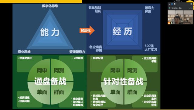 对于具体备战求职的方法,孔翔老师提出可以分为两个阶段。一是储备期,同学们可以通过参与名企项目、商赛、实习来提高各项能力。对于三年制和两年制的硕士研究生,孔翔老师分别提出了针对性的意见,制定了具体的实习规划。二是校招期,孔翔老师对网申、网测、群面和单面都做了详细的分析,分享了应聘时的注意事项。