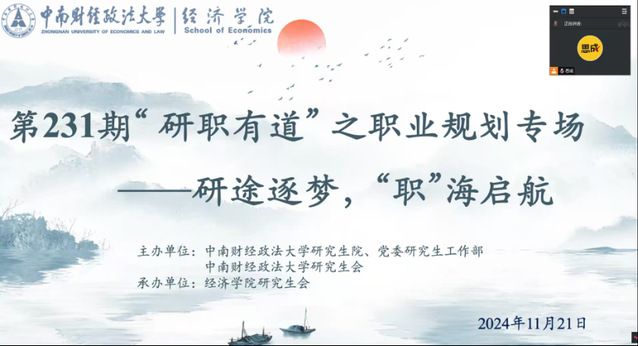 (学生通讯员 刘叶)为了丰富广大研究生的求职经验,帮助同学们更好地制定与职业目标相适应的个人发展计划,11月21日晚,由研究生院、党委研究生工作部、校研究生会主办,经济学院研究生会承办的第231期“研职有道”之职业规划专场活动成功举办。本次活动邀请了思成求职创始人兼CEO孔翔老师和米兰电竞·(中国区)经济类专业的Cecilia师姐进行求职经验分享。本次分享会由张芳主持,130余名研究生参与此次活动。