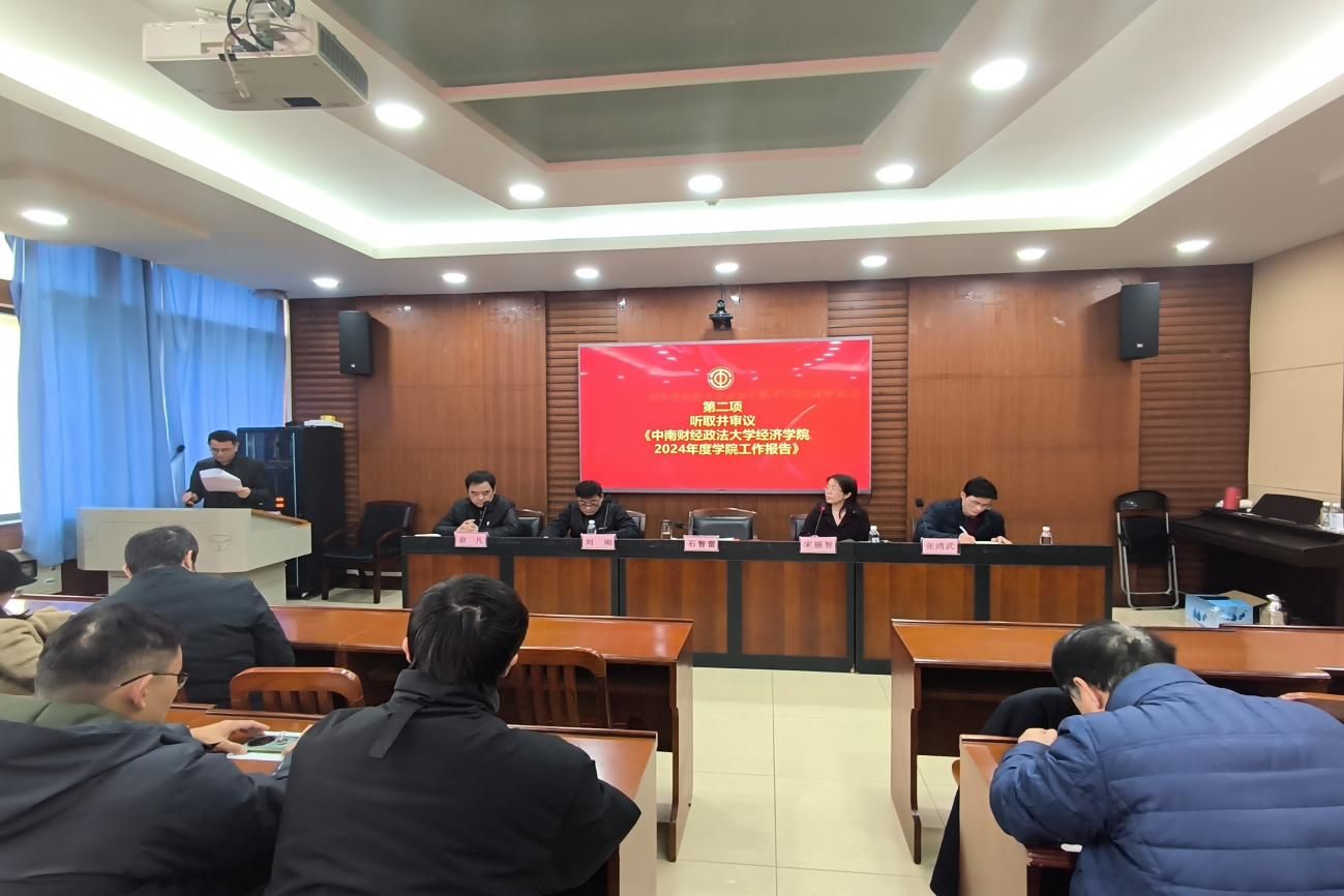 会议奏唱国歌后,石智雷院长代表全院领导班子作经济学院2024年度工作报告和财务报告,从党团工作、科学研究、人才培养、学科建设、师资建设、社会服务、国际交流、财务工作等方面回顾了学院本年度的工作情况,总结了学院在学生志愿服务、教工体育活动、教育教学质量、学科实力、科研论文等方面取得的可喜成绩和突破,并从人才培养体系建设、办公环境改善、制度建设等重点任务和党建、科研等常规工作出发,对学院2025年度工作做出规划。石院长向学院全体教职工本年度的辛勤付出表示感谢,希望2025年能够继续凝心聚力、奋楫笃行、勇攀高峰,为打造国内一流、国际知名的经济学院、推动经济社会高质量发展、服务国家重大战略需求贡献力量。