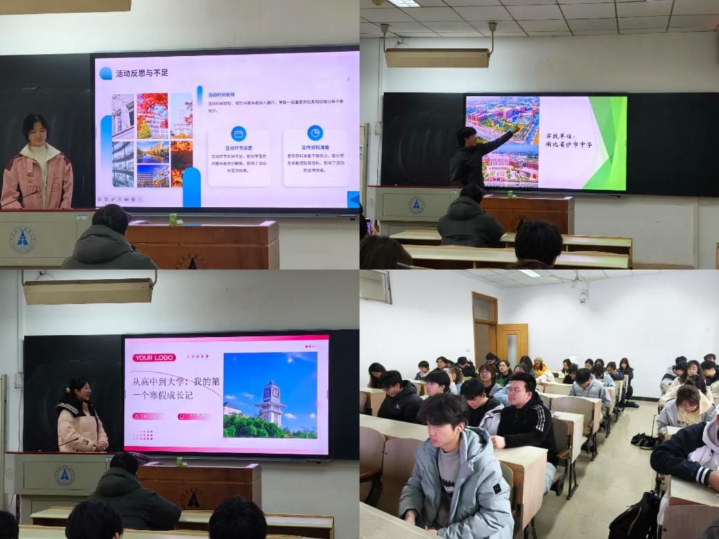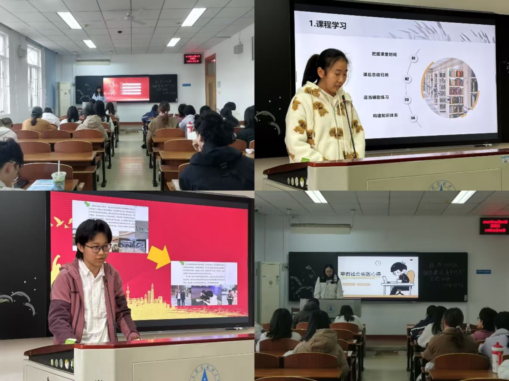 数经2401班石羽佳同学以“大学与未来”为主题,从“高效备考”“时间密码”“理想盲盒”等环节介绍了母校行活动,在青春的誓言中感受到了向上生长的力量,并期待今后通过延长活动时长、打造宣传矩阵、建立联动机制让强国建设的星火照亮更多青春征程;余越洋同学介绍了在母校行活动中,以“回忆高中时光”破冰,在“游园会”与“班级宣讲”的双线活动中,助力高中学弟学妹“破茧”,希望通过更加充分的准备和多元的活动,让青春的理想在学思践悟中拔节生长;苏丹婷同学以“高中假期与习题为伴,大学假期以星辰为引”道出从高中到大学的蜕变,并通过“行走齐鲁”“新年读书会”“规划假期生活”的经历,分享了经济学的专业知识在旅游、生活、学习等方方面面赋予的全新视角,同时将有限时光与无限可能相结合,期待通过“试错”为大学“赋能”。