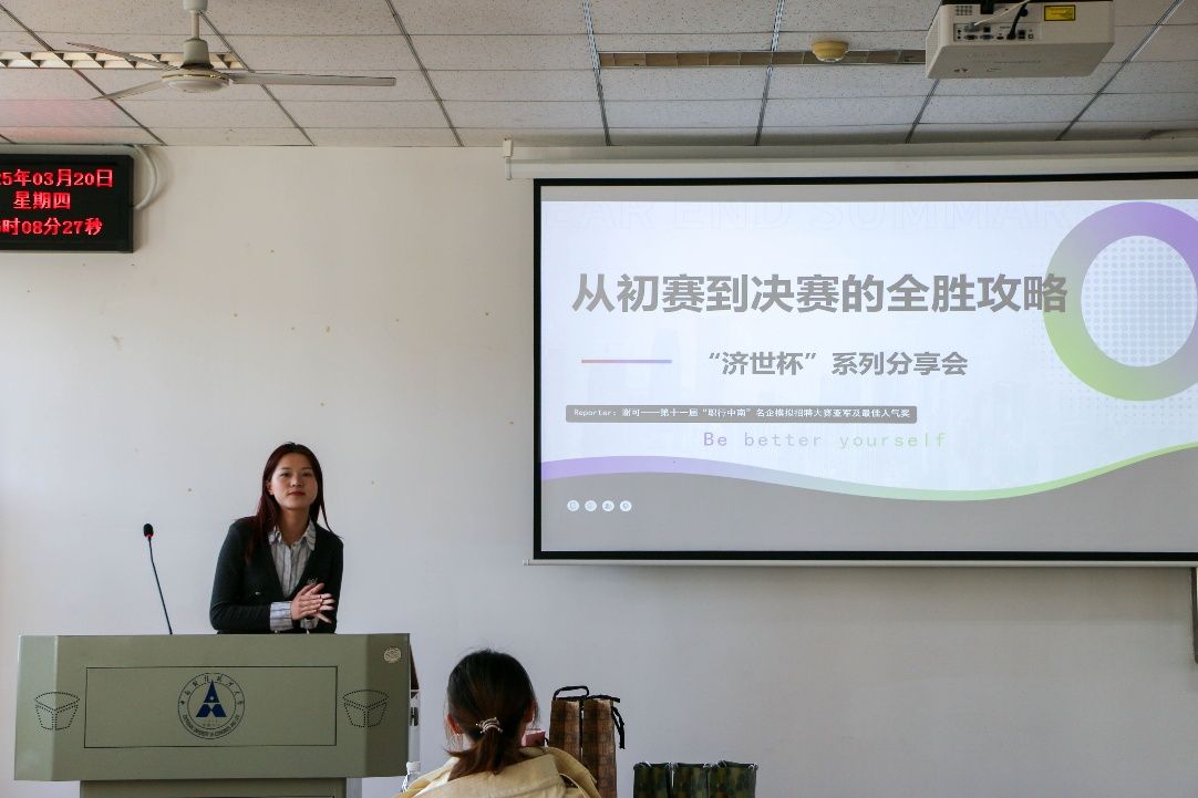 (学生记者 蒙楚妍 摄影 张宇轩)春风拂面,梦想启航。为帮助我院学子更好地了解就业市场,提升求职技能,并为即将到来的名企模拟招聘大赛做准备,“济世杯”第十三届“职行中南”名企模拟招聘大赛(以下简称“招聘大赛”)宣讲会于3月20日14:00在首义校区文润楼303教室成功举办。出席本次宣讲会的嘉宾有武汉同创教育科技集团CEO、武汉大学实习实践导师、中南民族大学企业导师杨浩然,第十一届“职行中南”名企模拟招聘大赛亚军及最佳人气奖得主谢可,经济学院学生会主席赵祎涵。我院团学志学员及2024级本科生到场参加大会。外联部学员陶爽主持。