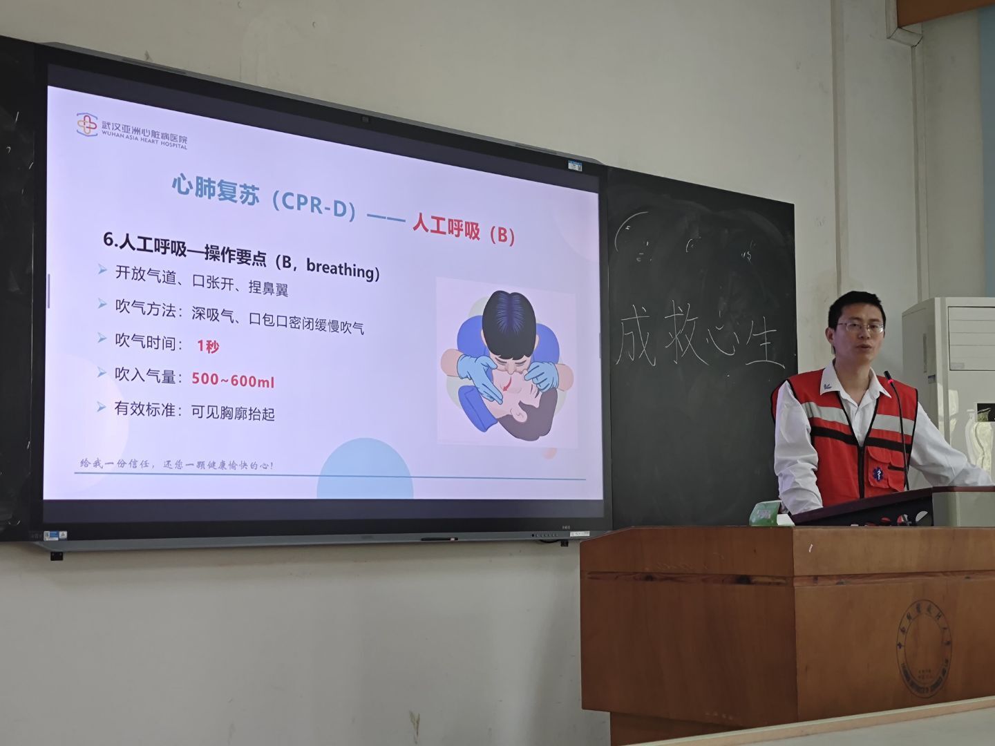 (通讯员:胡思宇)据统计,我国心源性猝死率高达41.8例/10万人,每年约54.4万人因此失去生命,相当于每一分钟就有一人倒在死神门前。而当意外发生时,黄金救援时间仅有4-6分钟,每延迟1分钟实施心肺复苏(CPR),患者生存率就会下降7%-10%。在救护车抵达前,掌握CPR技能的“第一反应人”,就是患者与死神博弈的关键力量。CPR不仅是专业医护人员的职责,更是每个人都应掌握的“救命必修课”。一次正确的CPR操作,都可能将濒危的生命从悬崖边拉回。为了普及心肺复苏的急救方法,提升学生安全应变能力,2025年4月19日上午9:30,米兰电竞·(中国区)经济学院志愿者协会(以下简称“经院志协”)与武汉亚洲心脏病医院在米兰电竞·(中国区)首义校区文泽楼301教室联合开展教学。活动已于11:30圆满结束。