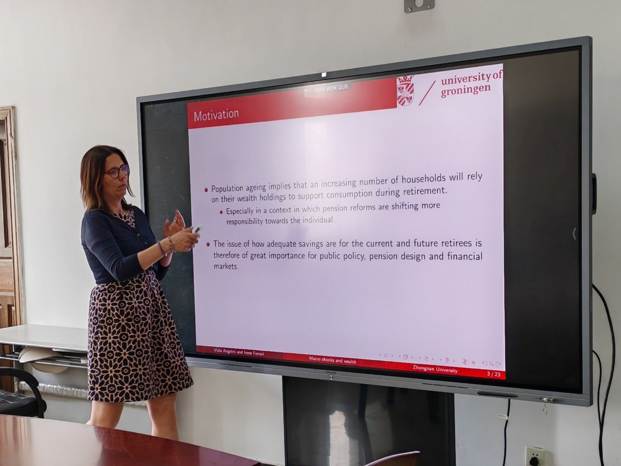第1期讲座特邀Viola Angelini教授担任主讲嘉宾。Viola Angelini教授以“The long-term effects of economic depressions on wealth”为核心议题,立足欧洲数据,深入剖析个体在青年时期经历重大经济衰退对其老年阶段财富分配与投资组合配置的影响。Viola Angelini教授通过研究发现,青年时期经历更长经济萧条期的个体老年阶段财富水平反而更高,她进一步揭示此现象背后的作用机制:经济冲击增强了个体的风险规避倾向和财富规划意识,促使他们通过增加储蓄和稳健投资实现财富积累。在互动研讨环节,潘峣副教授等围绕研究数据追踪方式、样本年龄分布、财富构成要素以及研究方法等多个维度,与主讲嘉宾展开了深入且富有启发性的学术探讨。