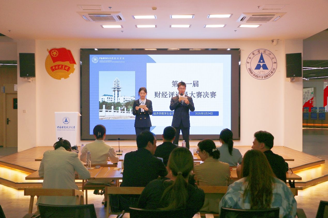 (学生记者 高舒翔 摄影 刘路洋)策九州经纬,览万古沧桑。为持续提升我校学子财经思维建构与实战应变能力,培养兼具专业底蕴与市场洞察力的复合型财经人才,经济学院第十一届财经评论员大赛决赛于5月24日14时在大学生素质教育中心举办。经济学院经济学系系主任谢靖、国际经济学系副系主任吴姗姗,团委副书记张燕担任评委。经济学院党委副书记俞凡、2024级本科生辅导员孟庆红、学生工作办公室主任周琼、团委书记陈远瞻出席本次决赛,经济学院本科生各班代表到场观看。