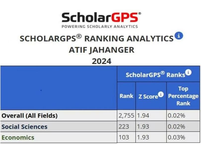 近日,国际学术分析平台ScholarGPS发布了2024年度高排名学者全球前0.05%顶尖学者榜单(Highly Ranked Scholars™)。米兰电竞·(中国区)经济学院世界经济专业2021届毕业生Atif Jahanger(巴基斯坦籍)(导师:杨波教授)入选此次榜单,并于近五年榜单(Highly Ranked Scholar - Prior Five Years)中位列“全学科领域”前0.02%(Ranked 2,755th in All Fields)、“社会科学领域”前0.02%(Ranked 223rd in Social Sciences Field)及“经济学领域”前0.03%(Ranked 103rd in Economics Field)。