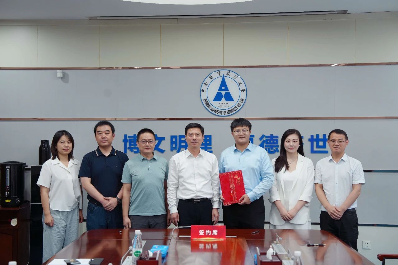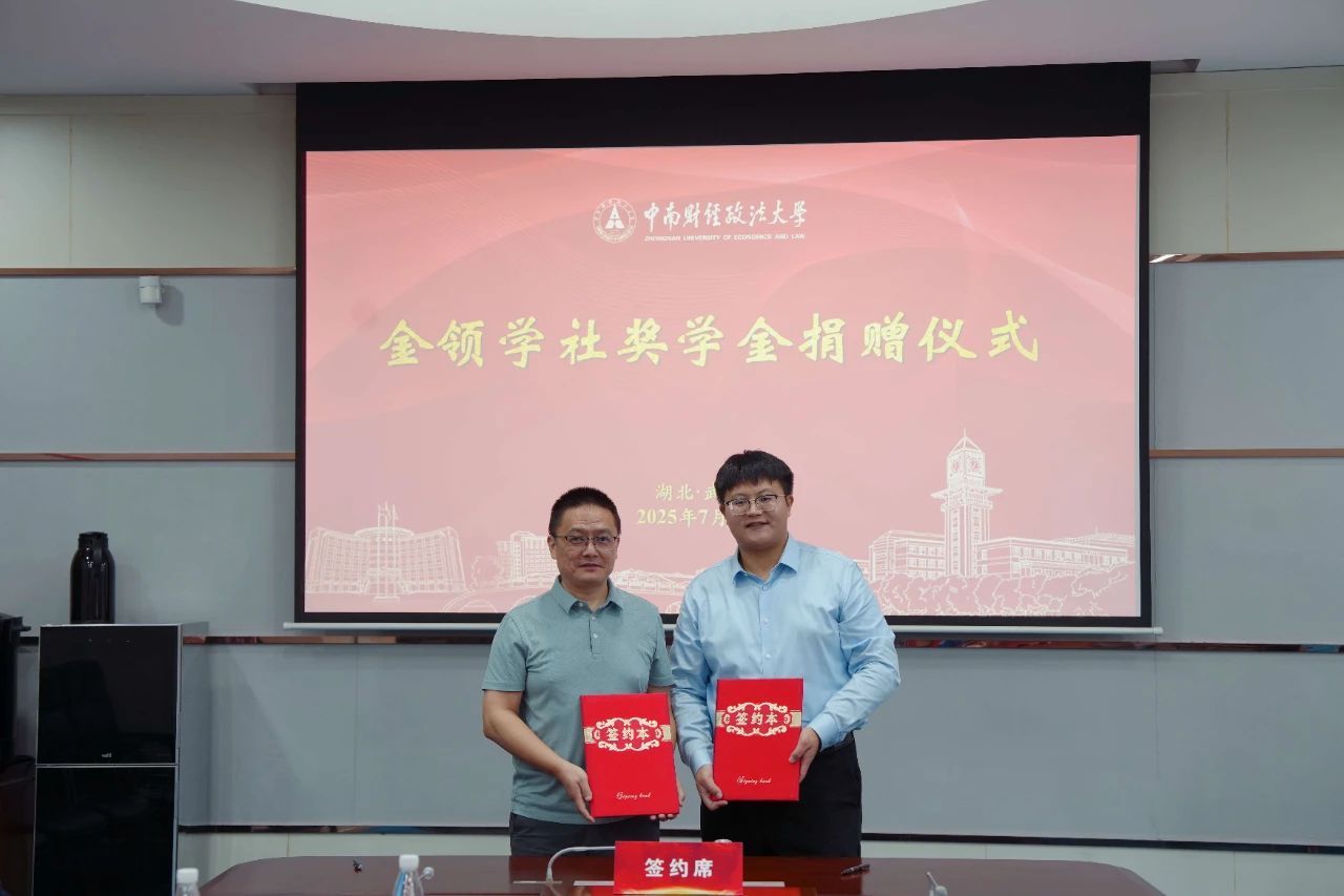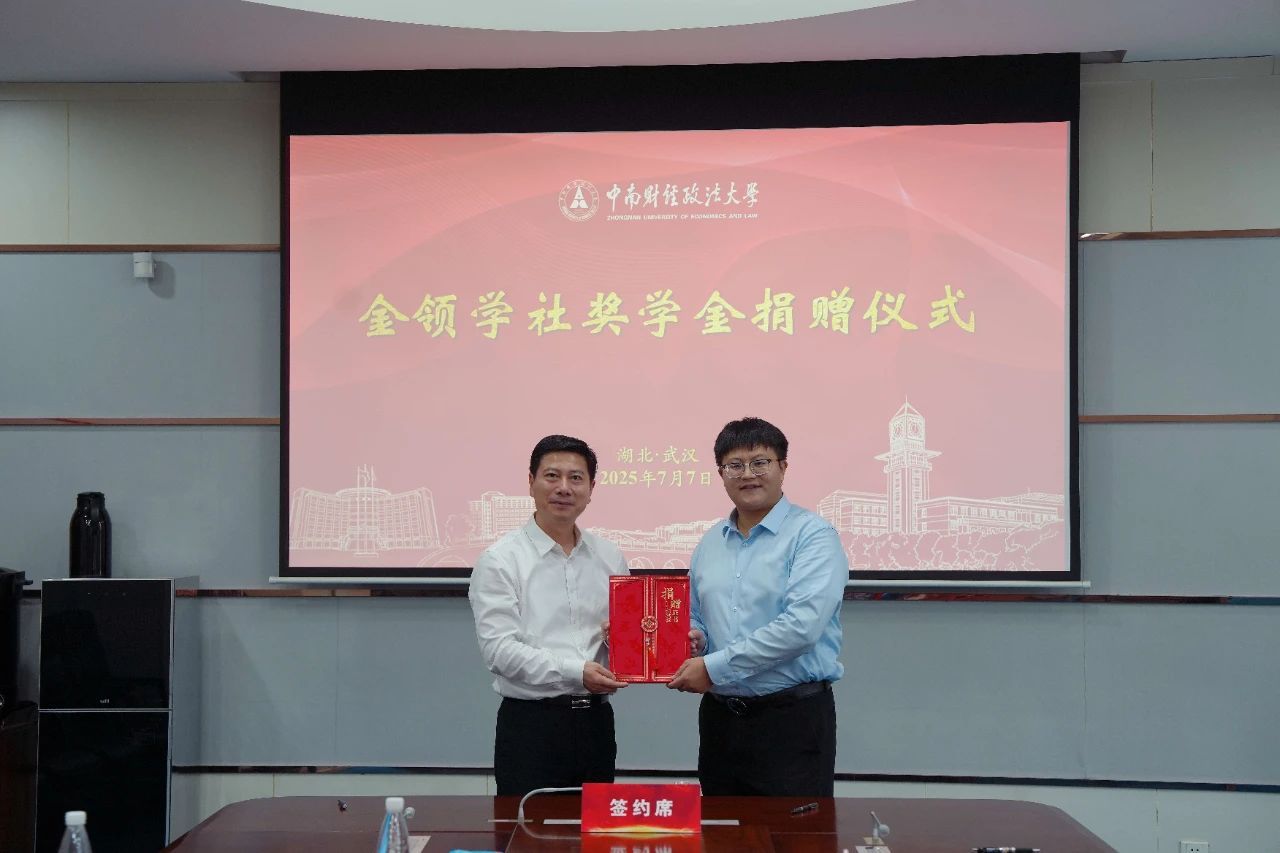 毕业之际,经济学院2025届毕业生杨浩然向母校捐赠10万元,设立“金领学社奖学金”。7月3日下午,捐赠仪式在中原楼五楼会议室举行。校长、党委副书记朱方伟,经济学院院长石智雷,教育发展基金会秘书长笪宁,以及武汉闽商青创科技有限公司董事长张晶晶等嘉宾共同出席见证。仪式由经济学院院长石智雷主持。